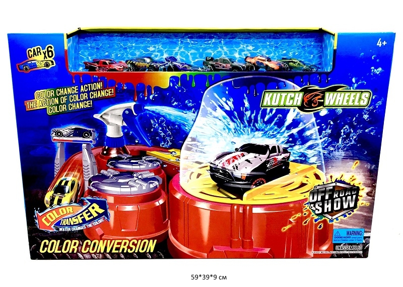 Игровой набор Водная горка включает в себя 6 машинок, базу с автомойкой, пистолет и станцию для мойки машинки. Поливая горячей и холодной водой можно увидеть как машинки меняет цвет.