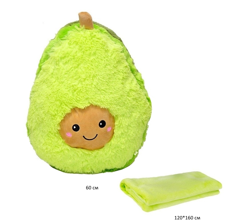 Мягкое, милое, нежное плюшевое авокадо можно использовать в качестве подушки, украшения для дивана или же просто как игрушку для ребенка. Игрушка очень приятна на ощупь. В комплект входит плед, такой же мягкий и уютный, который будет поднимать настроение в прохладные вечера. Подушка Авокадо 3 в 1 станет отличным помощником в путешествиях и выездах на природу. Игрушка держит свою форму и без пледа.