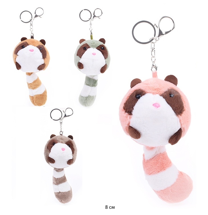 Брелок мягкая игрушка в виде очаровательного пухлого енота с длинным хвостом на металлическом кольце