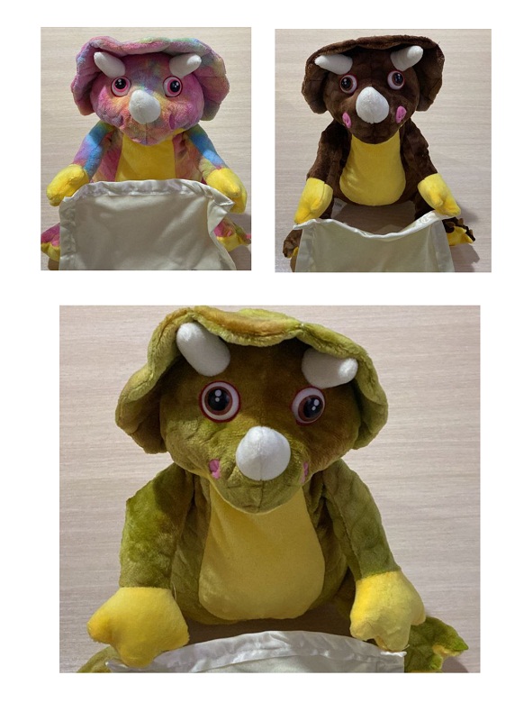 Игрушка выполнена в виде очаровательного динозавра трицератопса с платочком в руках.