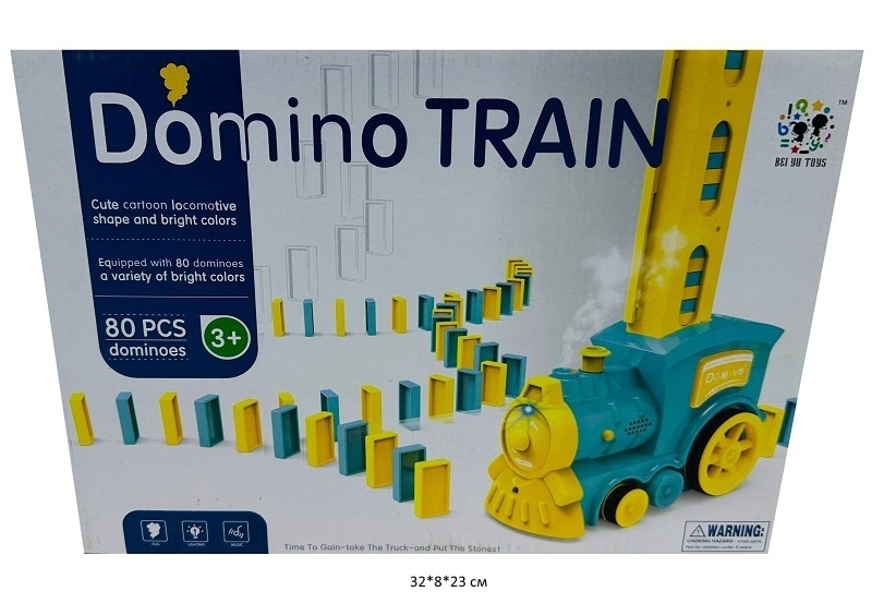 Забавный паровозик-домино выкладывает пластиковые блоки-доминошки (80 шт.) при движении. При этом паровозик издает интересные звуки, сверкает яркими огоньками и пускает пар!