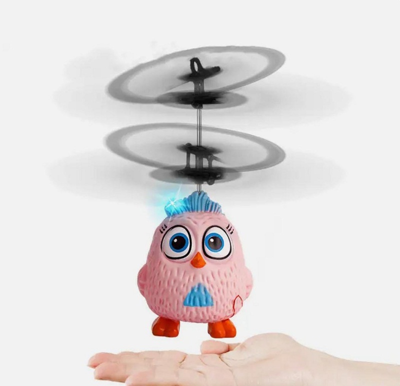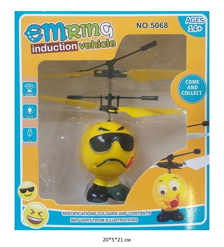 Смайлик арт. 5068 Летает от руки в кор.)Работает по принципу летающей феи, снизу датчики и при приближении объекта снизу, например, руки усиливают работу винтов и подлетают вверх по воздуху!