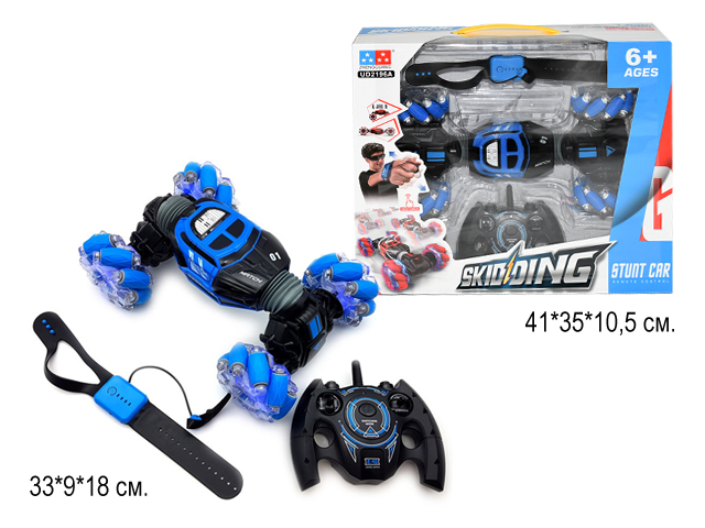 Машинка, которой можно управлять жестами с помощью пульта на руке, либо обычным пультом ДУ. Внедорожник легко ездит по бездорожью, вращается на 360 градусов, может ездить боком и в других направлениях. Машинка с мигающим светом и музыкой. Может менять дорожный просвет. Скорость до 20 км/ч. Для пульта д/у требуются батарейки 2хАА (в комплект не входят). Разворот 360 градусов. Заряда машинки хватает на 15-25 минут игры, в зависимости от использования и сложности рельефа.