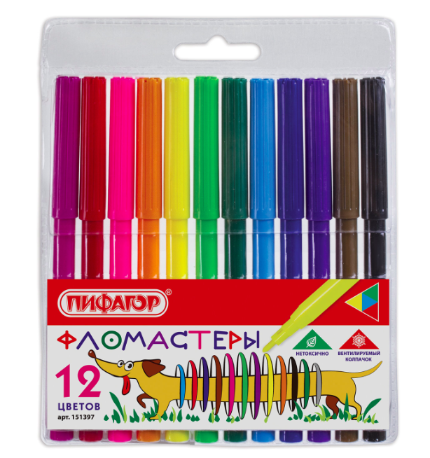 кс_Фломастеры арт. 151397 ПИФАГОР "Веселая такса" 12 цв, вентилируемый колпачок