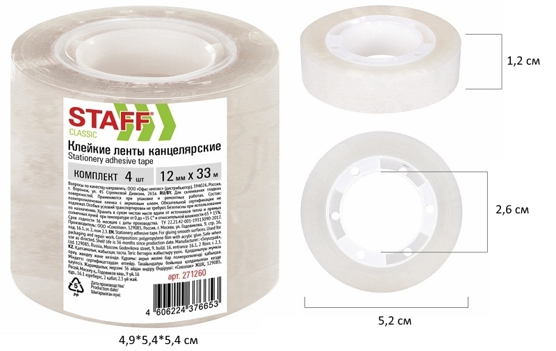 кс_Клейкие ленты арт. 271260 12 мм х 33 м канцелярские STAFF CLASSIC КОМПЛЕКТ 4шт. прозрачныеШирина ленты: 12 мм