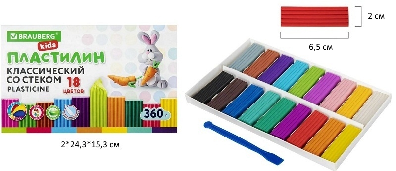 кс_Пластилин классический арт. 106510 BRAUBERG KIDS 18 цв. 360 г, со стеком