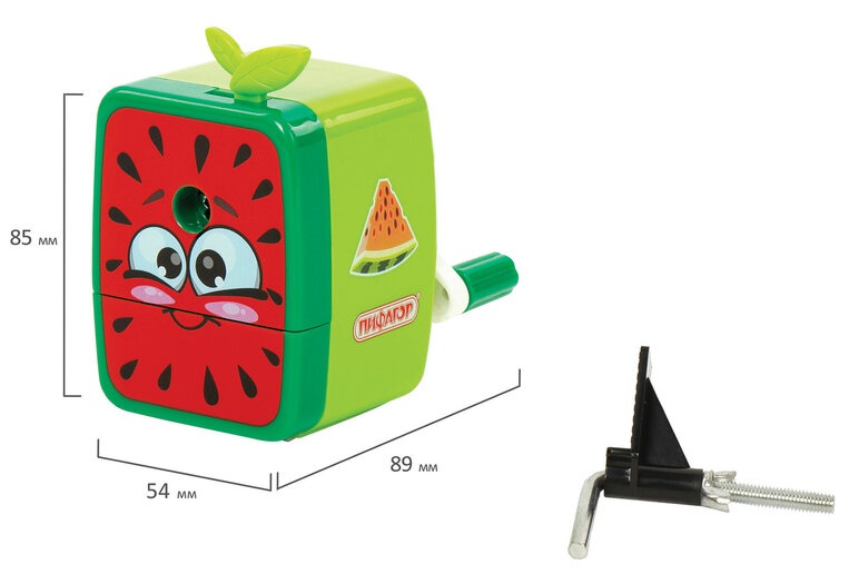 Невероятно оригинальная точилка "Арбуз". Корпус точилки выполнен из пластика. Вращающийся роликовый нож из высококачественной стали обеспечивает быструю и острую заточку. Точилка имеет одно отверстие и вместительный контейнер для сбора стружки. Диаметр затачиваемого карандаша - 8 мм. Размер: 85х89х54 мм. Точилка для карандашей ПИФАГОР "Арбуз" — незаменимый помощник в обучении!