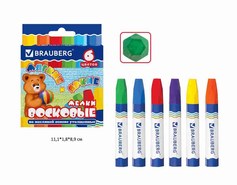 Восковые мелки формируют навык правильного захвата, снижают нагрузку на кисти рук, отлично развивают мелкую моторику. Идеальны для рисования на бумаге любого типа, а также дереве, картоне и стекле. Палитра состоит из 6 ярких цветов. Полностью безопасны в использовании, не токсичны, не имеют резкого запаха. Благодаря своему составу карандаши пишут мягко, ребенку не придется прикладывать усилия в процессе рисования. Утолщенная шестигранная форма корпуса и диаметр 11 мм делают их еще более удобными для тренировки руки к письму у дошкольников. Каждый карандаш завернут в бумажную этикетку, что предохраняет от загрязнений, снижает скольжение, увеличивает прочность. Восковые карандаши упакованы в картонную коробку с европодвесом.