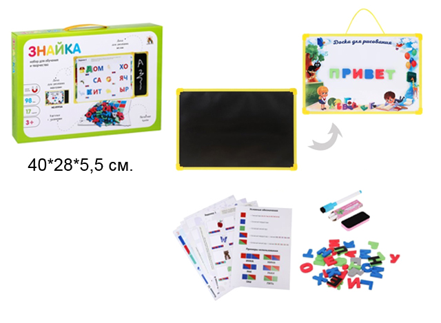 Набор для обучения и творчества включает двустороннюю доску, мягкую магнитную азбуку (комплект из 98-ми букв), маркер для рисования, мелки для рисования, губку для стирания и 17 заданий на 9-ти карточках. Мягкая магнитная азбука поможет ребенку выучить буквы и правильно их произносить; различать на слух и в произношении звуки гласные и согласные, твердые и мягкие; последовательно называть звуки в словах; определять ударный слог; строить звуковую модель слова; подбирать слова. Простое на вид занятие -сложение слов -задействует практически все отделы головного мозга. Чем раньше ребенок освоит чтение, тем больше у него будет преимуществ в будущем. Размер доски (ДхШ) составляет 39,5х27,5 см. Размер магнитной буквы: 3,2х3,2 см. Доска снабжена текстильной веревочкой-подвесом. Изготовлено из полимерных материалов с магнитными элементами.