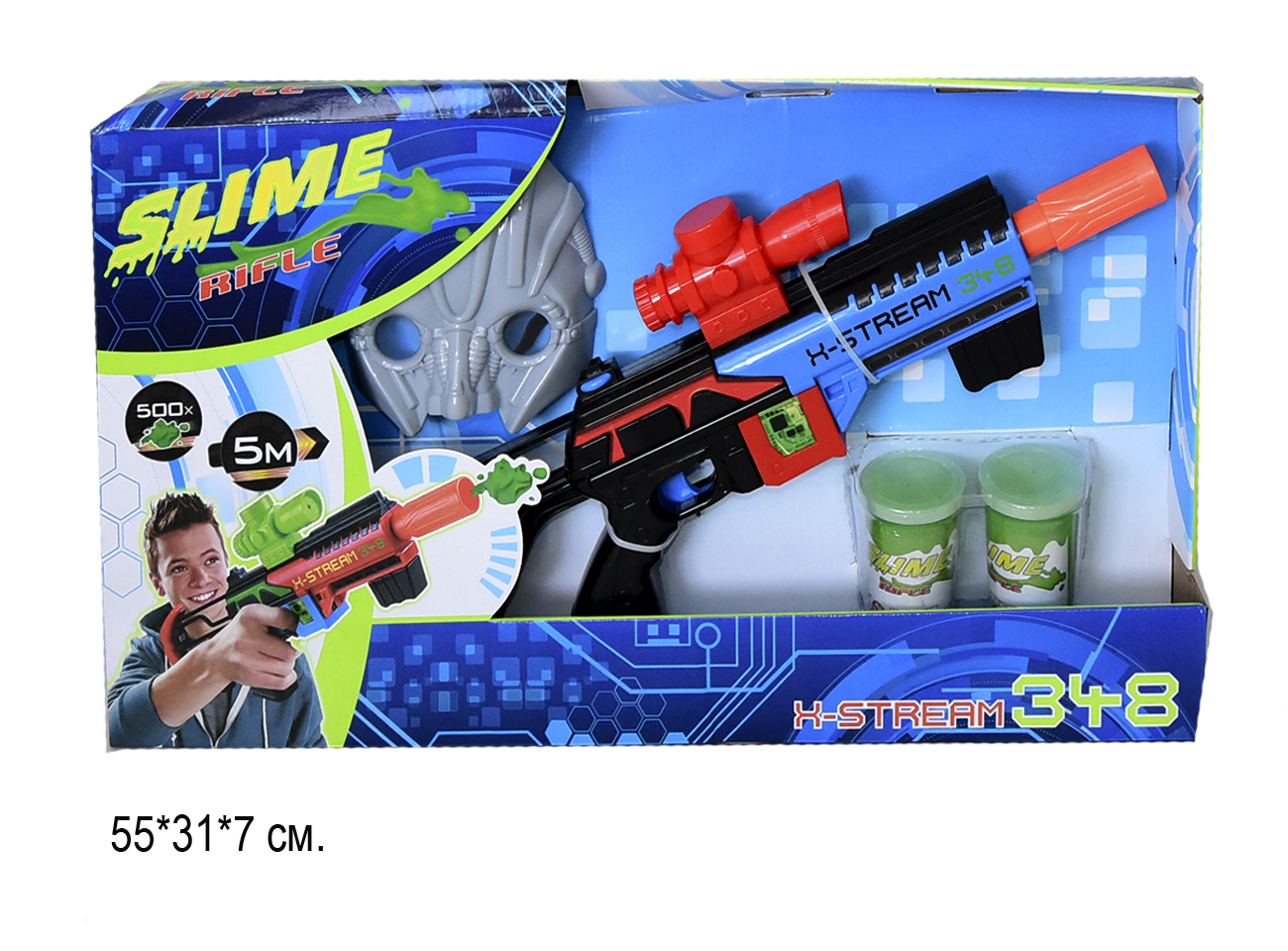 В комплекте: бластер, маска, мишень и 2 баночки со слаймом(лизуном)