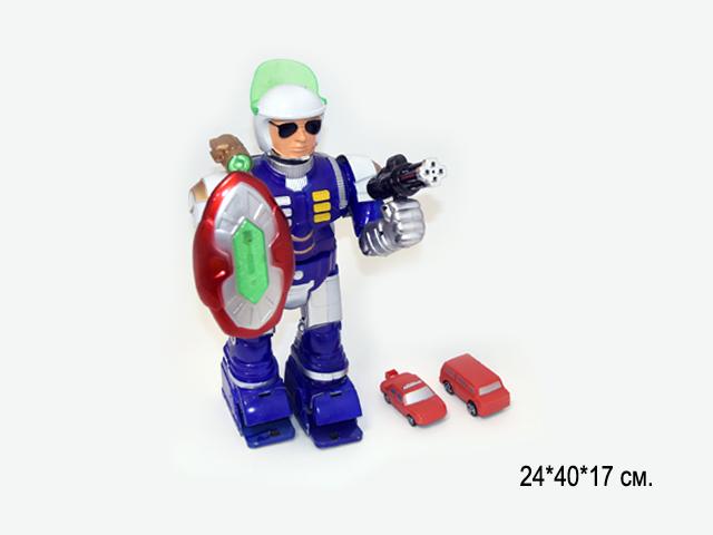 Робот с подвижными руками и ногами, со световыми и звуковыми эффектами (звуки стрельбы). Игрушка двигается вперед и поворачивает. Робот так же имеет щит и автомат, что позволит придумывать интересные сюжетные линии.