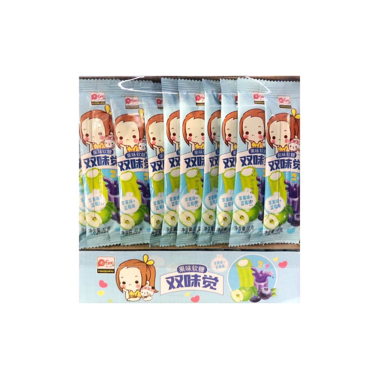 Конфета арт. 960090-3 Жевательная Трубочка-тянучка "Яблоко-черника" 12 г 30 шт в голубой кор.*