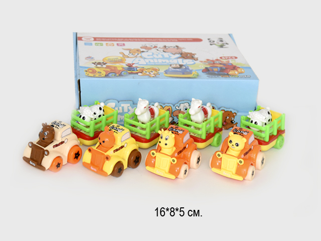 Яркие машинки с прицепом и зверятами имеют инерционный механизм движения: если машинку оттянуть назад и отпустить, она поедет самостоятельно. Игрушка хорошо тренирует мелкую моторику рук и координацию движений.