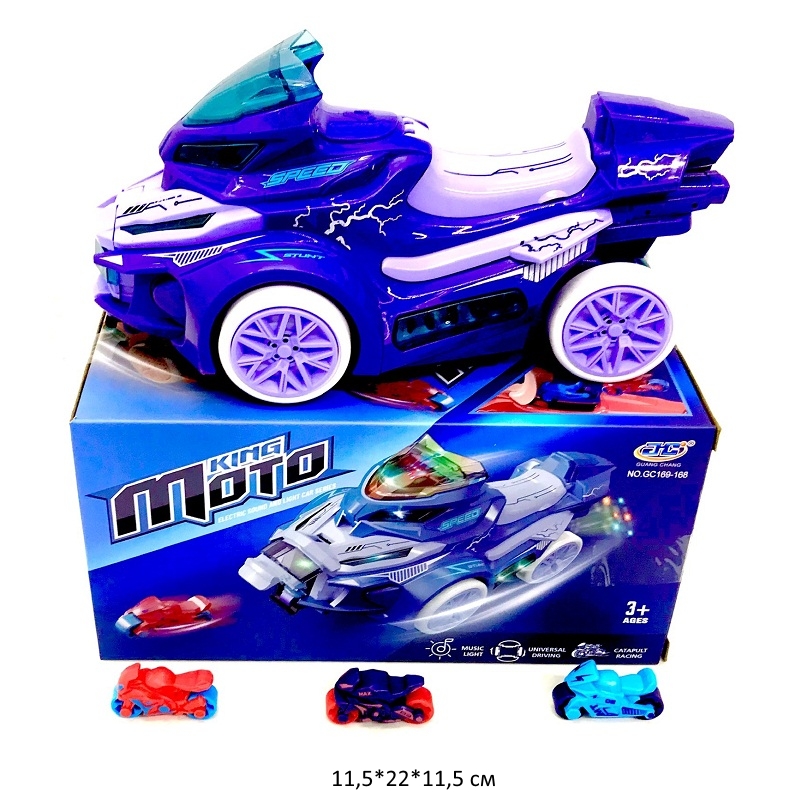Игрушка очень интересного футуристичного вида, на трех колесах, маневренная! Мотоцикл выстреливает из себя маленькие похожие мотоциклы. Игрушка катается в разные стороны под музыку, сверкая при этом разноцветными огоньками.