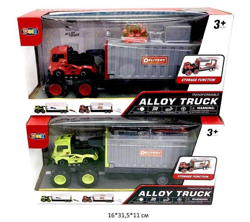 Металлический грузовик с открывающимся контейнером, в которм можно перевозить машинки или грузы в ящиках. В комплекте 2 машинки или грузы в ящиках. Транспорт катается вперед и назад. У машинок и тягача металлические корпуса. Колеса у джипа и платформы прорезинены. Тягач оснащен инерционным механизмом. Грузовой контейнер открывается, его можно использовать как удобный гараж для хранения машинок или грузов. Можно спустить машинки/грузы с горки. Тягач не отсоединяется от контейнера.